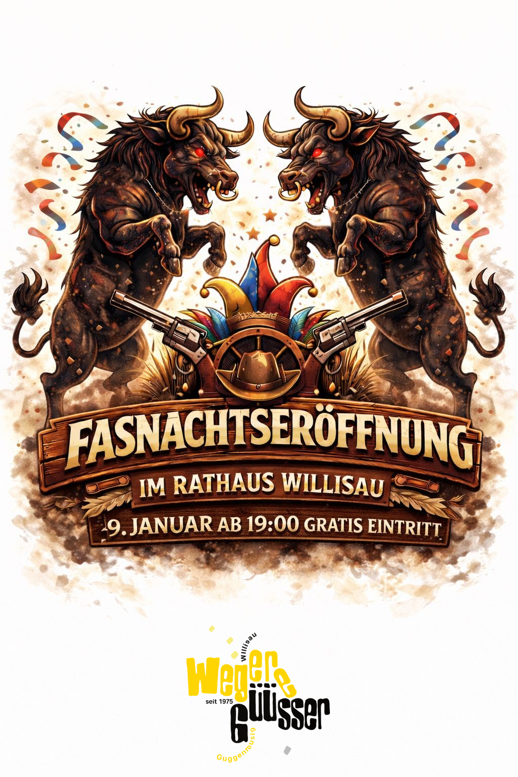 An der Fasnachtseröffnung in Willisau vom 9. Januar 2026 dürfen wir euch in einer etwas grösseren Version der Güüsser-Bar begrüssen. Wir werden das Rathaus in Willisau passend zum Motto der Karnöffelzunft verkleiden und bis in die Morgenstunden mit euch feiern und die Fasnacht offiziell eröffnen – seid gespannt, wir freuen uns!